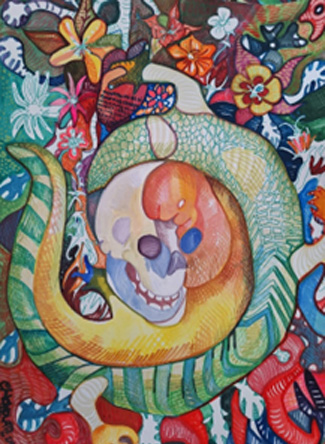 VIDA Y MUERTE Autor: CHOKOLATETítulo: Vida y muerteTécnica: Acrílico, acuarela y estilógrafoDimensiones: 35cm x 47cmAño: 2024