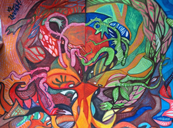 CONEXIÓN Autor: CHOKOLATETítulo: ConexiónTécnica: Acrílico, plumones y estilógrafoDimensiones: 47cm x 35cmAño: 2024
